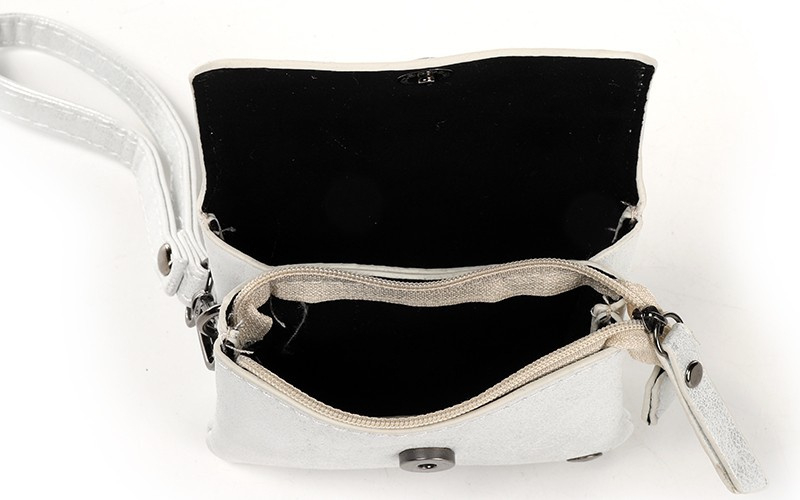 Daarnaast is er nog een even groot insteek vak zonder ritsje. Beiden worden afgesloten met een flap met magneetsluiting. Het portemonneetje wordt geleverd met polsbandje, ideaal om mee te nemen op pad!